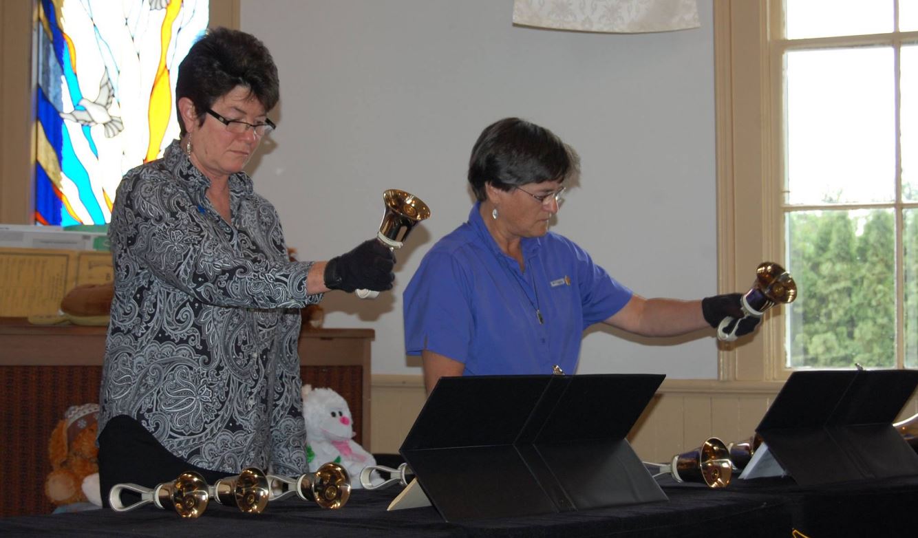 Handbells are ocassionally used to provide special music during services. Ginger Redlinger and Jean Akers are performing a handbell duet in the picture above.